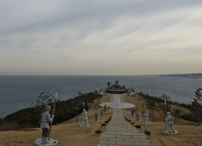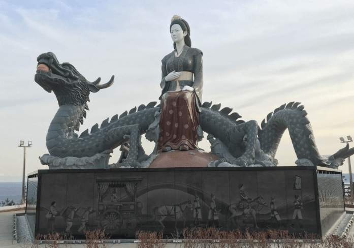정상에는 용을 타고 있는 수로부인(높이 10.6m, 무게 500t) 조각과 막대기를 두드리며 '바다노래'를 부르는 사람들의 동상이 설치돼 설화 속 장면을 재현합니다. 거대한 용과 수로부인, 웅장한 바다가 어우러져 상서로운 기운을 한눈에 느낄 수 있습니다.