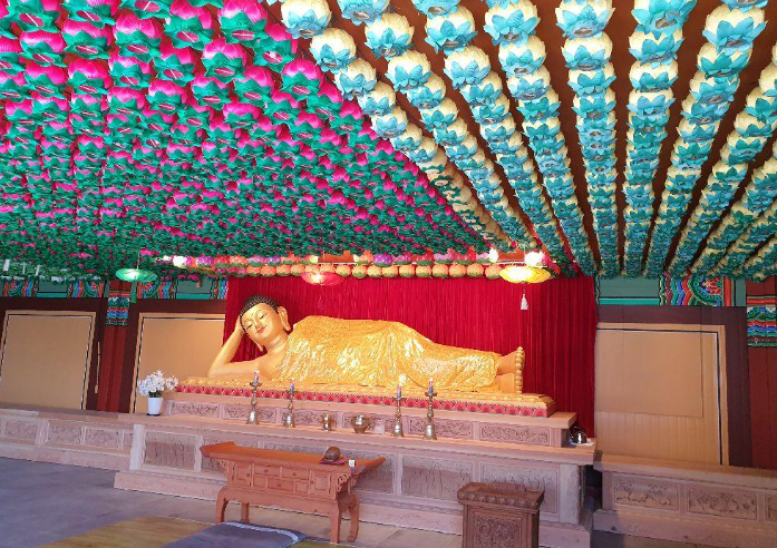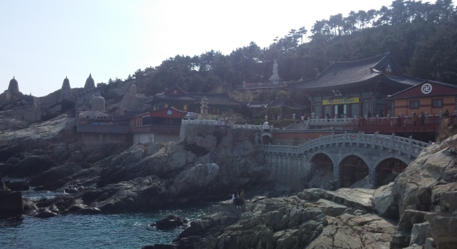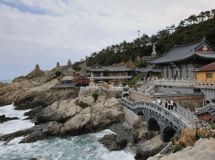 산속의 일반 사찰과는 달리, 부산의 탁 트인 바다 앞에 위치한 부산의 해동 용궁사입니다. 이 사찰은 임진왜란 때 파괴된 사찰을 1970년에 재건한 것으로, 바다를 배경으로 한국의 가장 큰 석상인 해화음대불을 세웠습니다.