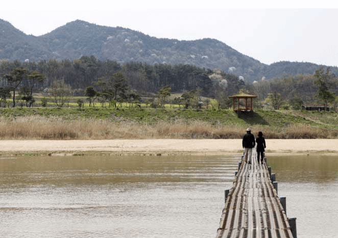 회룡포 마을로 들어가려면 첫 번째 다리를 건너야 합니다. 공사장에서 사용하는 철판으로 다리를 건설하고 구멍을 뚫었습니다. 고요한 마을이 걷기 좋고 회룡포와 내성천을 미로로 묘사한 회룡포름미리로 공원이 눈길을 끕니다. 마을에서 드라마 '가을동화', 예능 프로그램 '해피선데이 1박 2일' 등을 촬영했고 트로트 '회룡포' 가사가 들어간 노래도 있습니다. 회룡포는 연중무휴로 입장료는 없습니다.