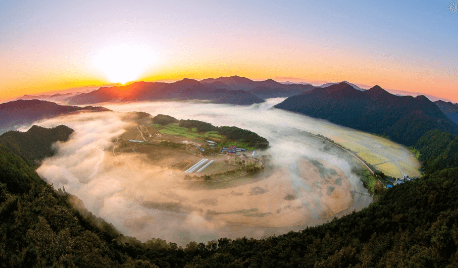 경북 예천군 용궁면은 '용'이 있는 마을 중 하나입니다. 이곳의 회룡포(명승)는 내성천이 산으로 막혀 마을을 350° 돌아감에 따라 回용이라 이름 지었습니다. 비가 많이 오면 섬으로 변해 '땅속의 섬'이라 불립니다. 회룡포가 한눈에 들어오는 전망대는 비룡산 회룡대입니다. 이곳으로 오는 길에 용왕각과 용바위도 있습니다. 회룡대에서 마을을 둘러싸듯 흐르는 강물을 바라보면 자연이 주는 신비로움과 아름다움에 절로 탄성이 느껴집니다.